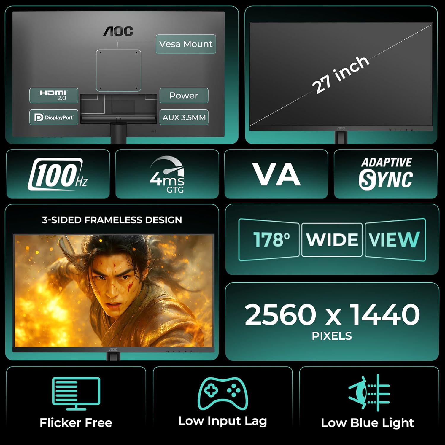 AOC Q27B3M2 Gaming Monitor 27 inch 2560 x 1440 QHD VA, 100Hz Refresh Rate, 4ms Response Time, Adaptive Sync, Low Blue Mode, 99% NTSC, 178° Wide Viewing Angle, 3-Sided Frameless Design, Tilt Stand