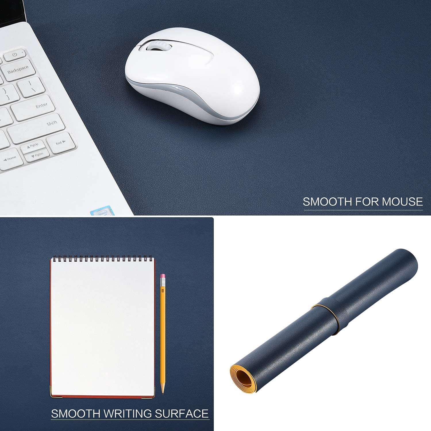 Large Desk Mat Dimensions: Measuring 27.6 x 13.8 inches, (70 x 35 cm) and Color: Blue and Yellow, with a 0.2cm thickness, this oversized mouse pad provides ample space for laptops, keyboards, and mice. Made from durable vegan leather, it protects your desk from scratches, stains, heat, and spills while offering a professional two-tone reversible design in Navy Blue and Yellow.