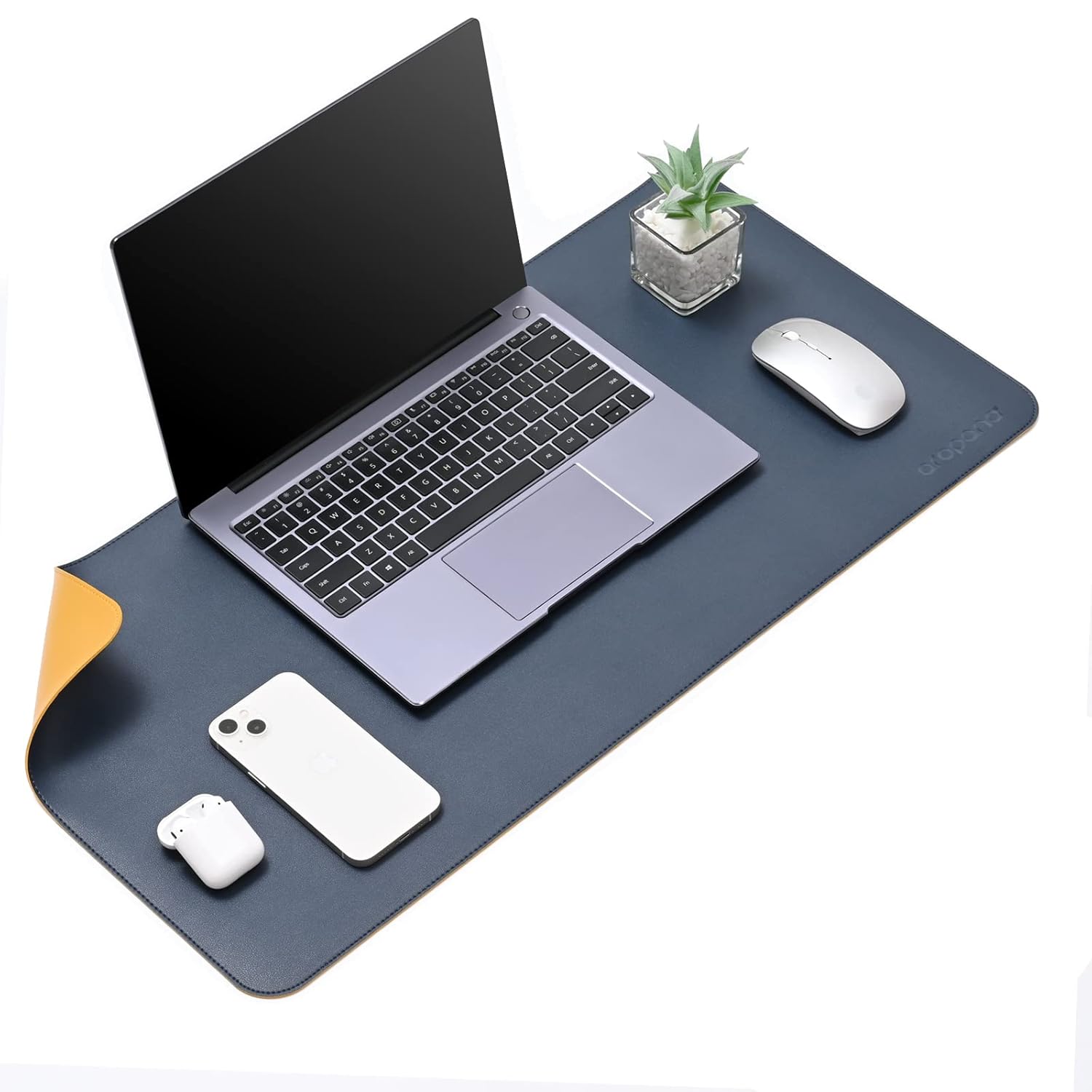 Aropana Vegan Leather Desk Mat | Large Reversible Mouse Pad & Computer Table Protector | Dual-Side Waterproof Extended Laptop Pad with Edge-Stitched Design (27.6 x 13.8 inch, Navy Blue and Yellow)