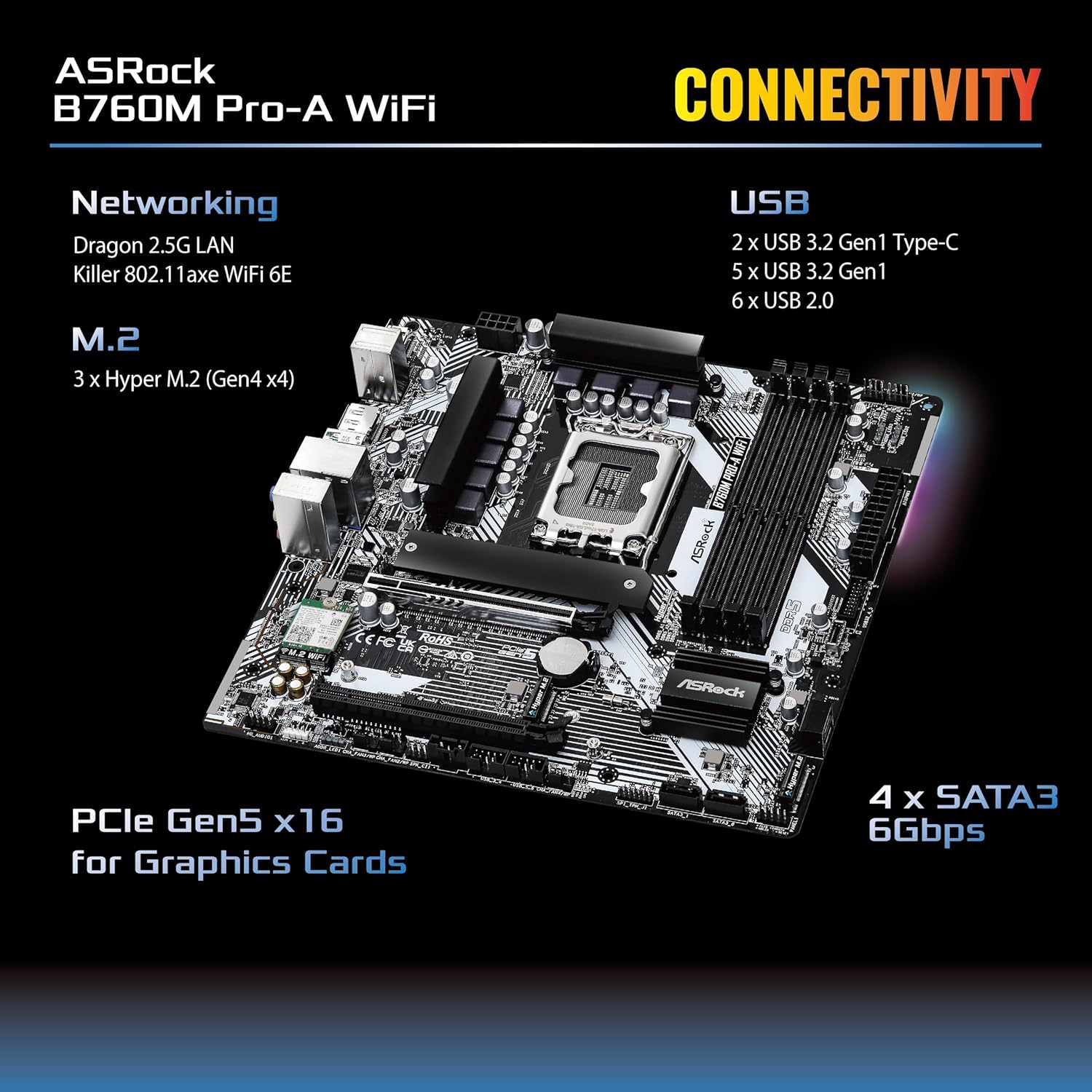 Supports 14th, 13th & 12th Gen Intel Core Processors (LGA1700) 7+1+1 Power Phase, Dr.MOS for VCore+GT 4 x DDR5 DIMMs Supports Dual Channel, up to 7200+ (OC) 1 PCIe 5.0 x16, 1 PCIe 3.0 x16 Graphics Output Options: 1 HDMI, 1 DisplayPort Realtek ALC897 7.1 CH HD Audio Codec 4 SATA3, 3 Hyper M.2 (PCIe Gen4x4) 2 USB 3.2 Gen1 Type-C (1 Rear, 1 Front), 5 USB 3.2 Gen1 Type-A (3 Rear, 2 Front), 6 USB 2.0 (2 Rear, 4 Front) Dragon 2.5G LAN Killer 802.11axe WiFi 6E + Bluetooth Supports ASRock Auto Driver Installer