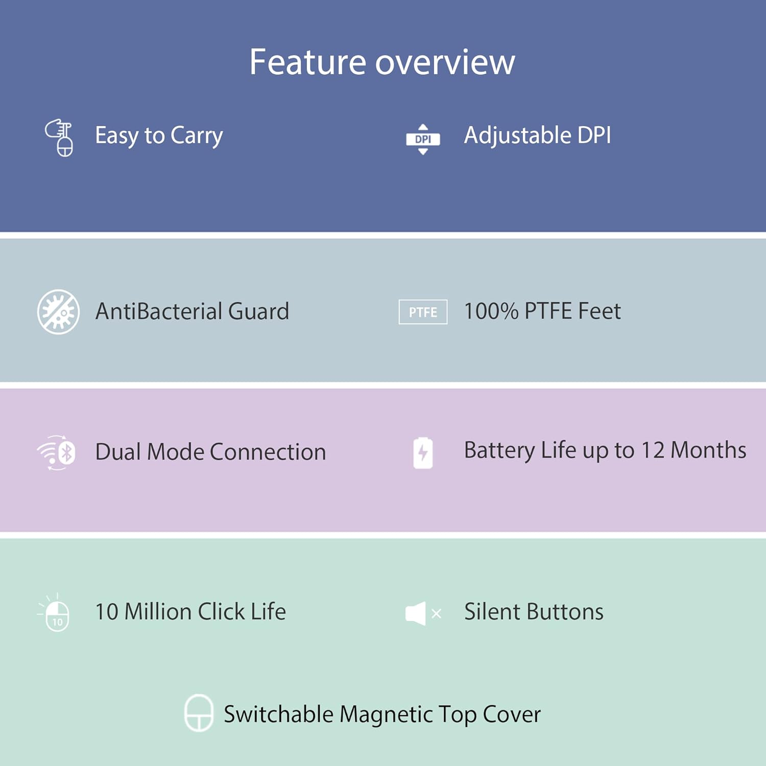 The compact ASUS Marshmallow Mouse MD100 adds a dash of vibrancy to your day with its quick-switch magnetic covers, and a handy strap that makes it easy to carry around. For safety and better hygiene, the covers include ASUS Antibacterial Guard and also offer easily adjustable DPI levels for varying degrees of precision, plus 100% PTFE mouse feet for a smooth glide on any flat surface.