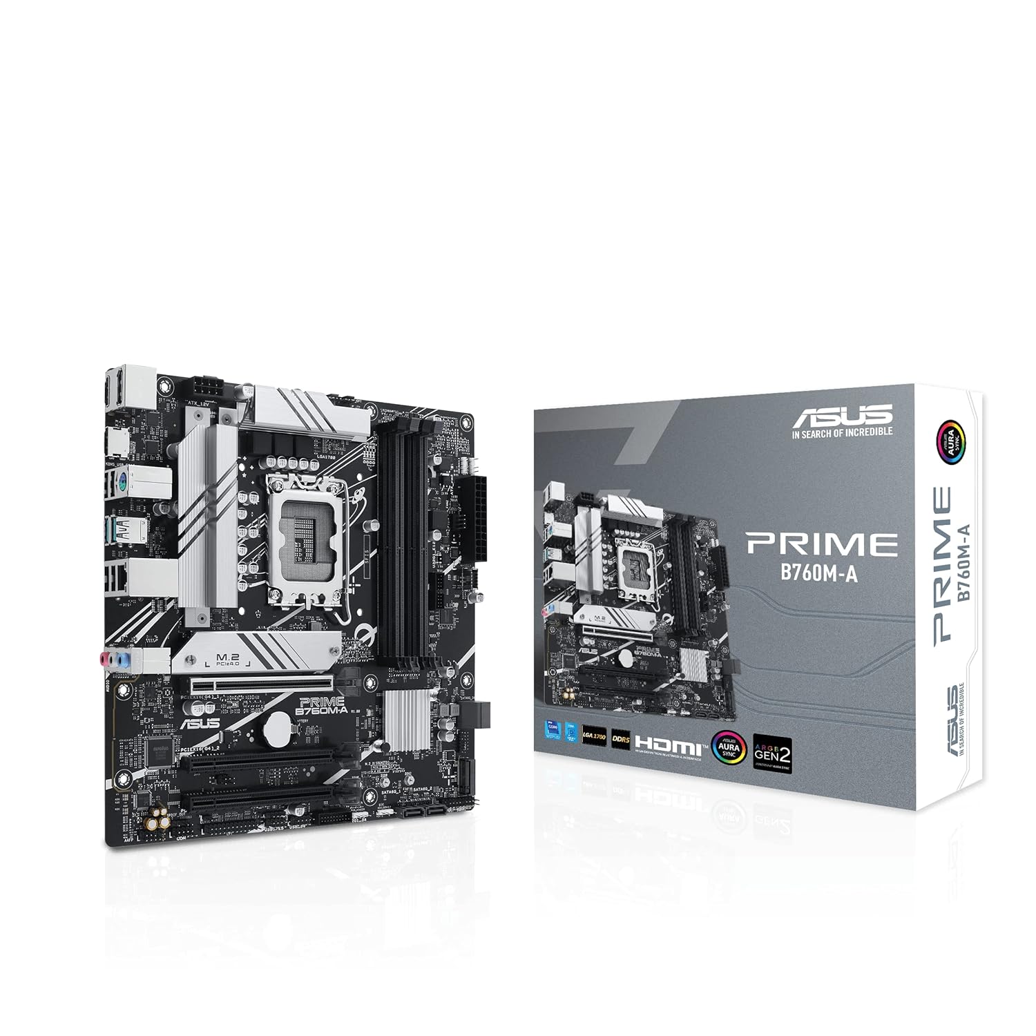– PRIME B760M-A is equipped with outstanding features, including 8 power stages, 6-layer PCB design, DDR5 7200+ (OC)*, PCIe 4.0 support, two M.2 slots, Realtek 2.5Gb Ethernet, rear USB 3.2 Gen 2 ports, front USB 3.2 Gen 1 Type-C®, DisplayPort/Dual HDMI™, Addressable Gen 2 headers, Aura RGB header, Aura Sync, Q-LED Core, ASUS OptiMem II, AEMP II, Fan Xpert 2+, Power Saving, Armoury Crate, ASUS 5X PROTECTION III, SafeSlot Core+.D11