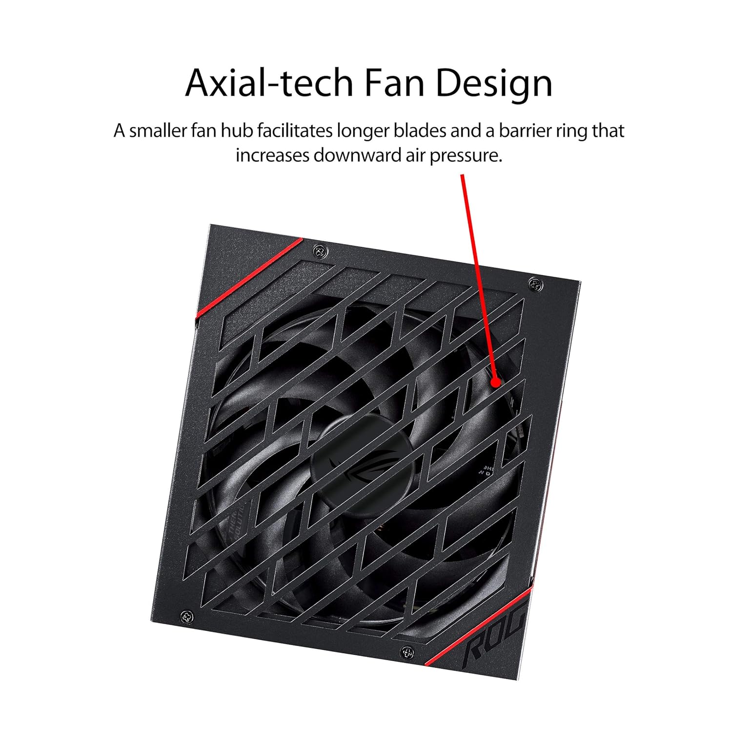Axial-tech fan design features a smaller fan hub that facilitates longer blades and a barrier ring that increases downward air pressure.