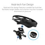 Axial-tech fan design features a smaller fan hub that facilitates longer blades and a barrier ring that increases downward air pressure.