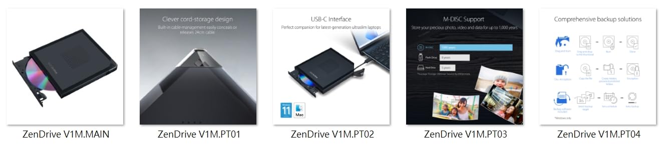 Enjoy playing audio CDs and multimedia from DVDs, burning discs, installing software and much more with ASUS ZenDrive V1M, the all-new, high-style external DVD drive and writer. Crafted with sleek, self-storing USB-C cable design, ZenDrive V1M is the perfect complement to the latest-generation ultraslim laptops – in the office or on-the-go.