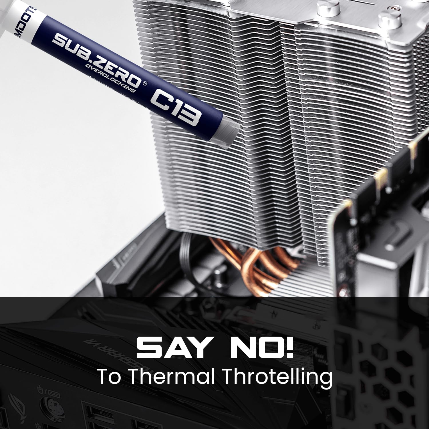 Sub.zero Overclocking C13 is an ultra-high-performance thermal paste featuring an impressive thermal conductivity of 12.8 W/m*k, making it especially suitable for low-temperature cooling methods like nitrogen or compressor cooling. The fine base particles of C13 Thermal Paste minimize the risk of temperature-related issues, reducing the likelihood of nitrogen cooling cracking and maintaining optimal thermal conductivity.
