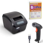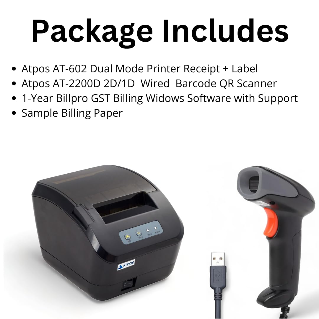 COMPLETE KIT: Includes AT-602 80mm thermal receipt + Label printer, 2D wired barcode scanner, and one-year BillPro POS billing software subscription
