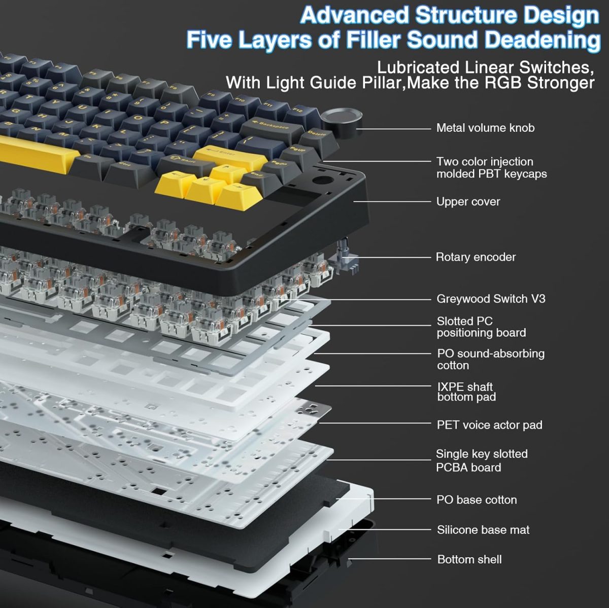 【Hot-swap Custom Keyboard】This custom mechanical keyboard with hot-swappable base supports 3-pin or 5-pin switches replacement. Even keyboard beginners can easily DIY there own keyboards without soldering issue. F75 gaming keyboards equipped with pre-lubricated stabilizers and LEOBOG Graywood V3 switches, bring smooth typing feeling and pleasant creamy mechanical sound, provide fast response for exciting game.