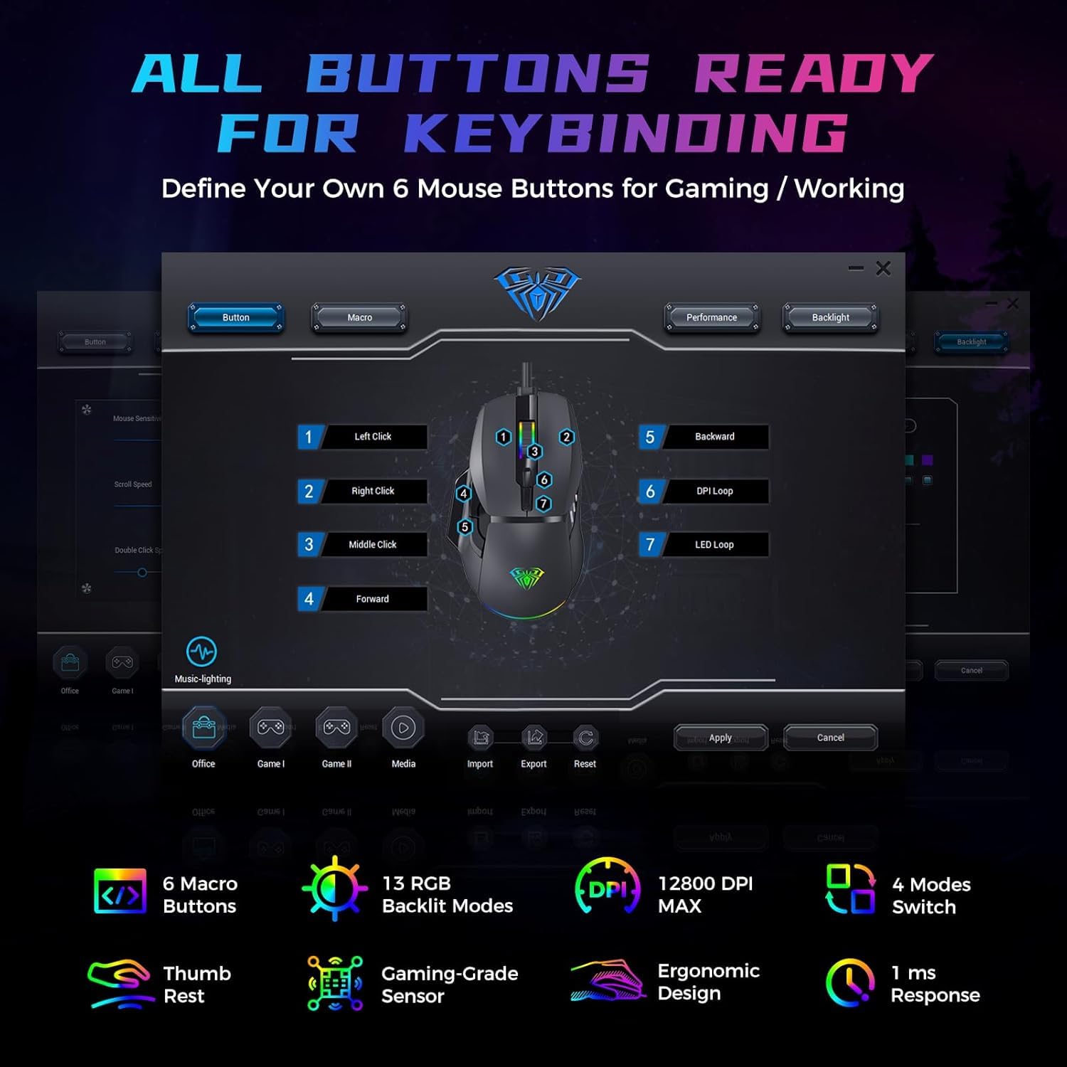 6 DPI Levels: AULA Gaming Mouse with up to 12800 DPI sensitivity and ultra-fast 1ms report rate delivers competitive level performance for easy wins in the game. All levels of Mouse Gaming DPI can be reset via driver (default as: 1200/2400/3200/4800/7200/12800), easy to switch between different scene needs