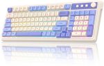 MULTI-DEVICE CONNECTION: AULA light up Keyboard offers 3-connectivity modes including Bluetooth 5.0, 2.4GHz wireless and USB wired mode, you can switch flexibly to suit different scenes. It can connect up to 5 devices at the same time and can be easily switched with the FN+ key combination. No limit to keyboard connectivity for all environments – home, office, outdoors and beyond! COOL RGB BACKLIT KEYBOARD: This LED keyboard features 16.8 million RGB light color, with 16 pre-set lighting effects to add a great atmosphere to the game. Lighting brightness and speed can be adjusted by the knob or the FN+key combination. With Macro soft, you can create unique lighting setup to make your rgb keyboard more interesting and create a personalized work or gaming environment. CUSTOM KEYBOARD: All keys on this wireless keyboard support macro customization, which allows you to record and edit macros to program a series of complex actions into a key, useful in very exciting real-time games. Bluetooth keyboard is equipped with dual-mode rotary knob for easy adjustment of volume, audio and lighting effects. Enjoy the fascination of technology and a new experience with the purple membrane keyboard. DUAL COLOR KEYBOARD: This 96% layout typewriter keyboard wireless with numeric keypad, separate numpad area provides you with a more familiar experience. AULA S99 computer keyboard binds 3 colors keycaps to make your desktop more beautiful! This retro keyboard is not only a tool, also a door to the depths of memory, each time you hit the clicky keyboard is like going back to your childhood playing by your grandma’s side, letting you relive that classic and nostalgia in the modern life. SMOOTH TYPING EXPERIENCE: Ergonomic Keyboard features a foldable 2-stage kickstand, allows you to choose the tilt angle that best suits you for a better keying posture. Our pc keyboard offers 3 buttons – M1/M2/M3 allowing you to remap key functions or merge multiple keys into a single key. USB keyboard cute compatible with WinXP/7/8/10/MAC/Android/iOS for gaming. NOTE: Listing color will not match 100% with the physical product color. NOTE: 1 Year warranty from the date of purchase for manufacturing defect only.