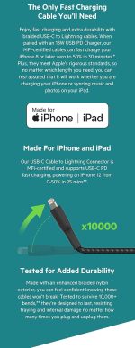 Supports fast chargingAvailable in 1M/3.3FT, 2M/6.6FT, and 3M/9.9FT***MFi certified for peace of mindTested to withstand 10,000+ bends for ultimate longevity.