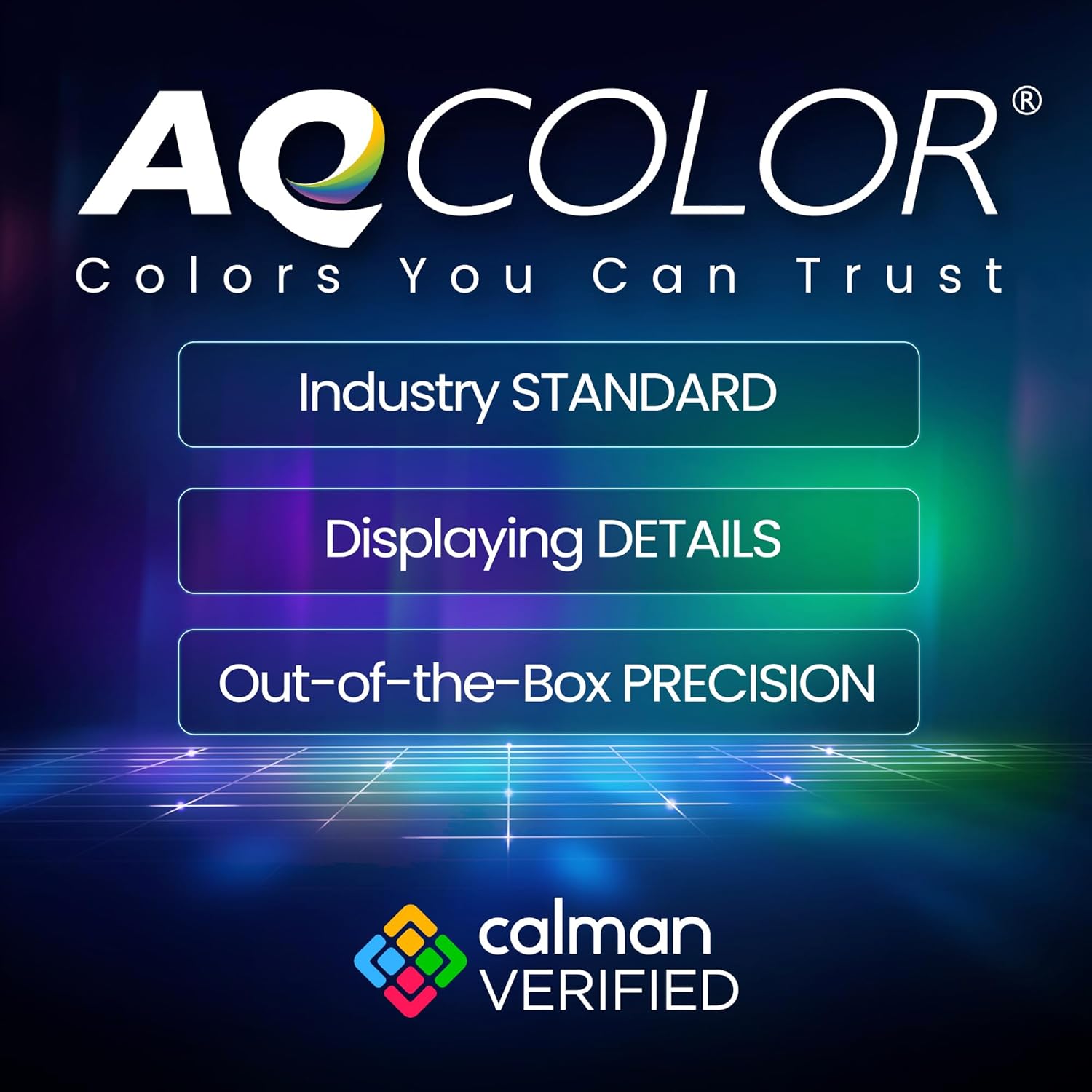 AQCOLOR delivers out-of-box precision with an avg. Delta E≤2, 95% P3 coverage, and corner uniformity