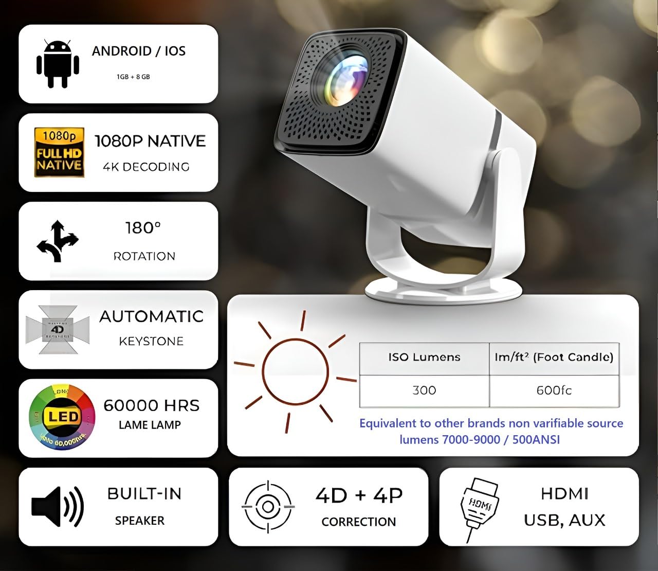 Small is the new BIG, the Atom 3X ultra Portable Projector is capable of decoding stunning 4K Resolution at base 1080p Native. 5000 : 1 Contrast deliveres a visual Feast at 3X Brightness with HDR & 4K Support on Massive 210″ (533 cm( Screen Size. LTPS Cinemascopic Wide Screen LCD (16:9) | “Life Long Lamp” – 60000 Hours.Industry’s Best Amologic Chip T950S Quad Core Processor, ARM Cortex 450 GPU with 1GB-8GB | Dual Band Wifi6 (2.4+5 GHz) | Bluetooth 5.0 | Screen Mirrorning | Pre Loaded OTTs Netflix, Youtube, Sonyliv etc. | Seamless Navigation and access to 9000+ apps, no external TV stick needed. The T950S chip delivers smooth and responsive performance, ensuring lag-free streaming and gaming.