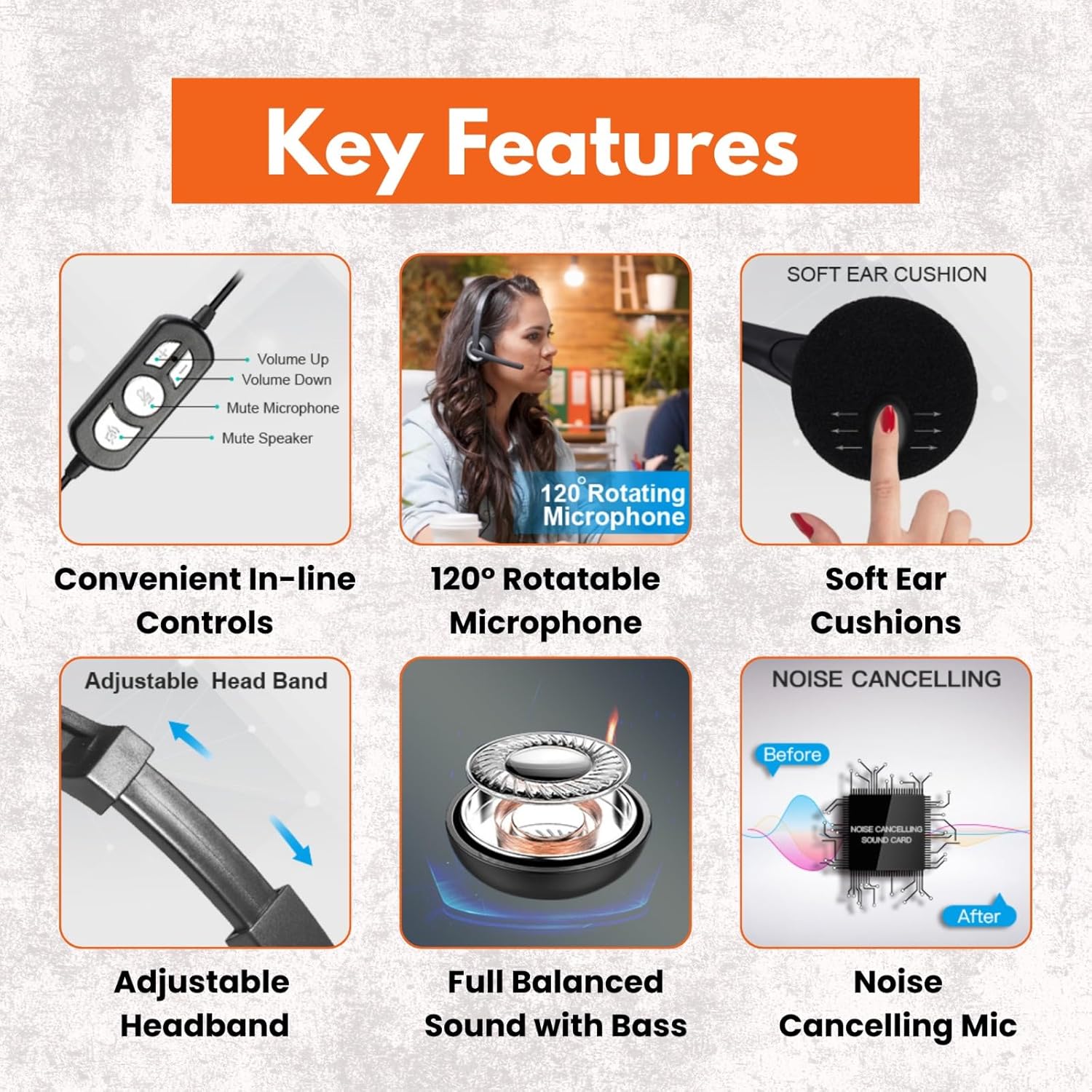 USB PLUG & PLAY WITH NOISE CANCELLING MIC: Enjoy crystal-clear HD audio with a reliable USB connection—no software or drivers needed. The built-in microphone features advanced noise-cancellation technology, filtering background sound for perfect communication during work-from-home, online classes, or Zoom meetings. OPTIMIZED FOR OFFICE CALLS & ONLINE CLASSES: Specifically designed for Skype, Zoom, Google Meet, MS Teams, and online learning. Whether you’re attending virtual meetings, teaching, or gaming, this professional-grade wired USB headset delivers consistent performance and reliability. IN-LINE SOUND CONTROLS FOR EASY ACCESS: Built-in controls on the headset let you easily adjust volume, mute mic or headphone, and check status via LED indicators—no need to fiddle with system settings during important calls or sessions. LIGHTWEIGHT COMFORT WITH ADJUSTABLE FIT: Weighing just under 119 grams, the headset features soft foam ear cushions wrapped in fabric for long-term comfort. Fully adjustable headband and mic arm allow a personalized fit for all-day wear without pressure or irritation. IMMERSIVE 3D SOUND & STRONG SUPPORT: Equipped with 40mm electromagnetic drivers for surround sound and deep bass—great for music, movies, and casual gaming. Backed by India-based customer support and warranty assistance for peace of mind.