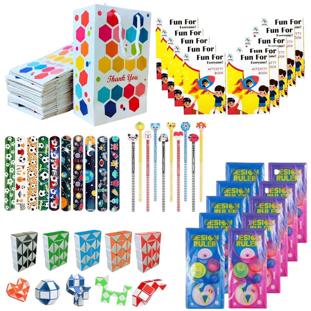 All-in-One Brain Teaser Combo Pack: Includes Design Rulers .Boom Pencil, Activity Books, Snake Puzzles, Slap Bands, and Goody Bags for hours of engaging entertainment and creativity!