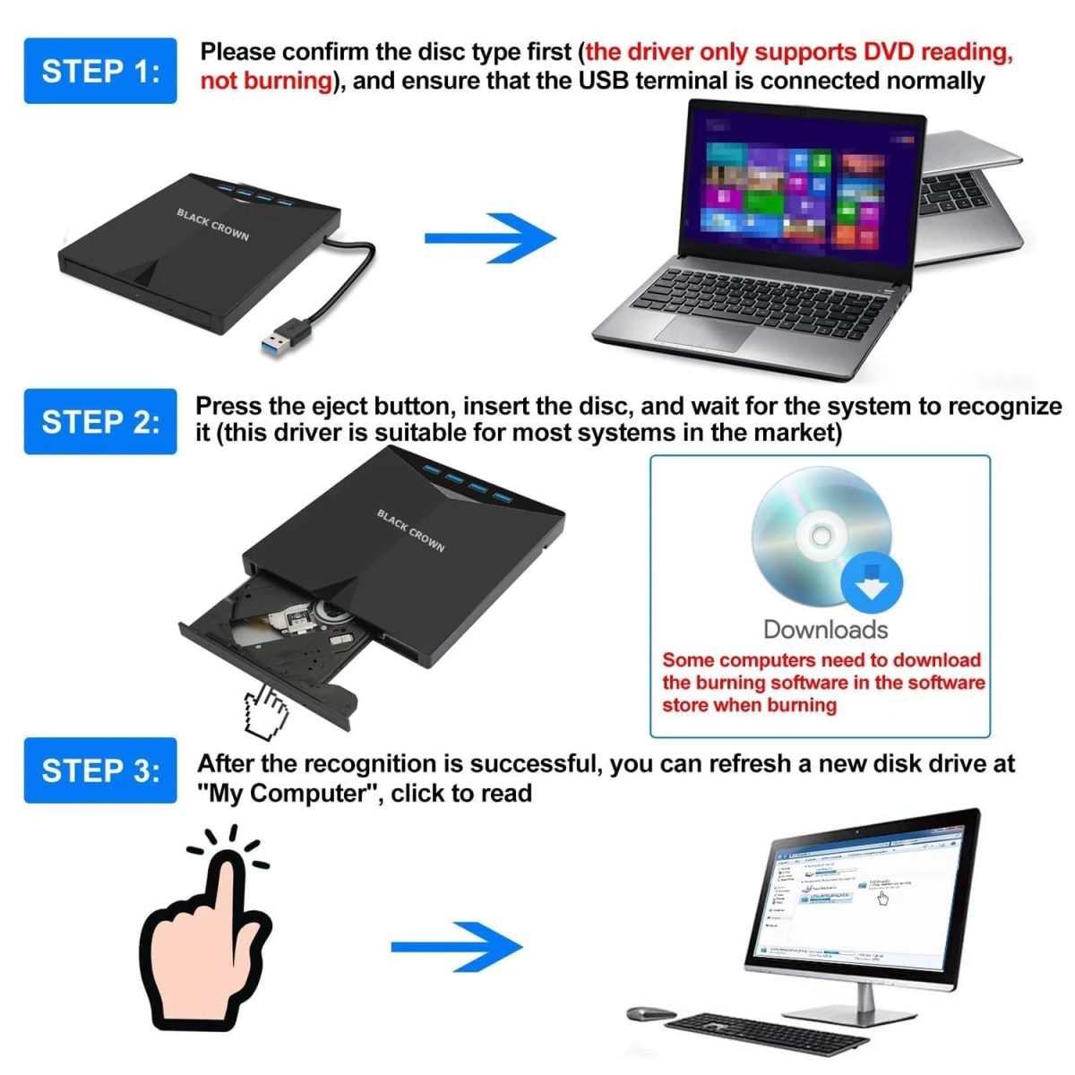 【Effortless Plug & Play】 No need for additional drivers or power sources. Simply connect to your laptop or desktop via USB 3.0 or USB-C for instant use. Perfect for watching movies, burning CDs/DVDs, or transferring data