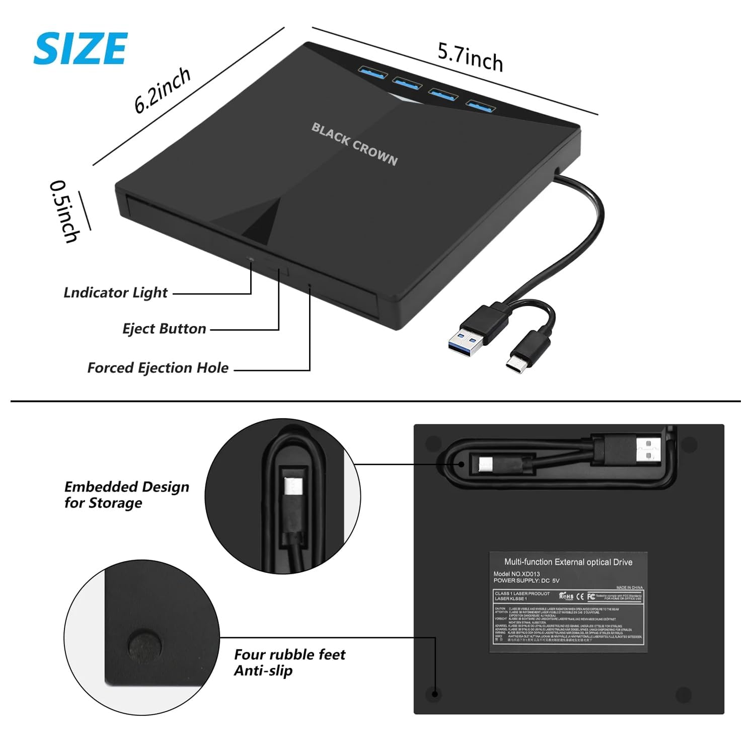 【7-in-1 Multifunctional Drive】 This versatile external dvd drive not only reads and writes CDs and DVDs, but also serves as a 4-port USB 3.0 hub, SD card reader, and TF card reader. (Note: SD and TF cards cannot be used simultaneously)