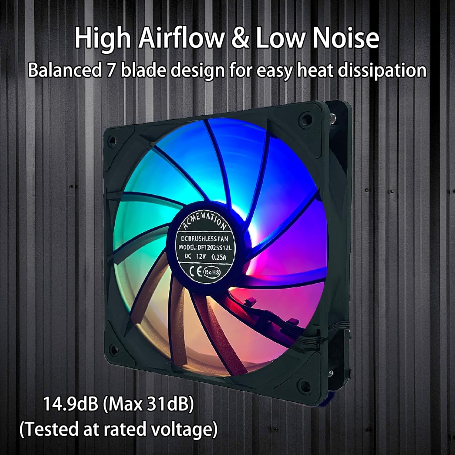 120mm Case Fan Low Noise CPU Cooler 120 mm Blue LED PWM Computer Cooling Fan with 4-Pin Connector 120mm Case Fan, comes with 2510-4P connector, Blue LED, PWM function The impeller was designed with a focus on minimzing the noise level yet delivering the desired airflow and pressure Specification Dimension: 120*120*25 mm (4.7*4.7*1 inches) Bearing Type: Hydraulic Bearing Rated Voltage: suitablevoltageV DC Current: 0.32A Input Power: 3.84W Speed: 900-1600 rpm (+/- 5%) Airflow: 61 cfm Noise Level: 28 db