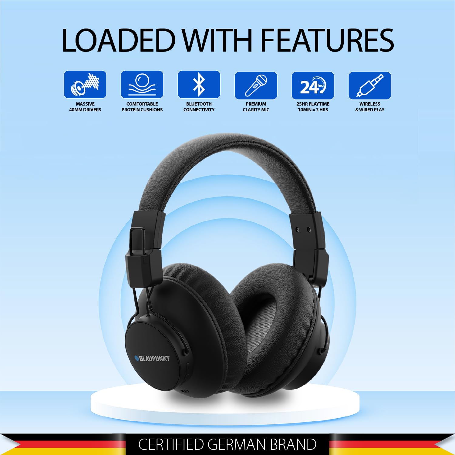 Blaupunkt Newly Launched BH41 Bluetooth Wireless Over Ear Headphones I Long Playtime I 40MM Drivers I Foldable I Flexible & Light Weight I Built in Mic I TurboVolt Fast Charging