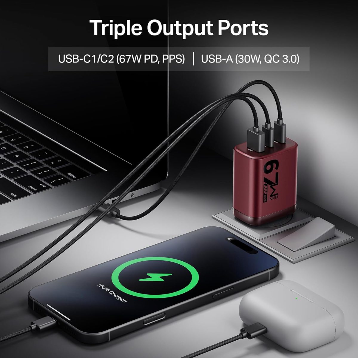 3 Output Ports & Auto-Detect Technology: Need to charge multiple devices? With USB-A (30W QC 3.0) and dual Type-C ports (67W PD, PPS), this charger delivers 45W + 7.5W + 7.5W (Max) across 3 smart output ports.