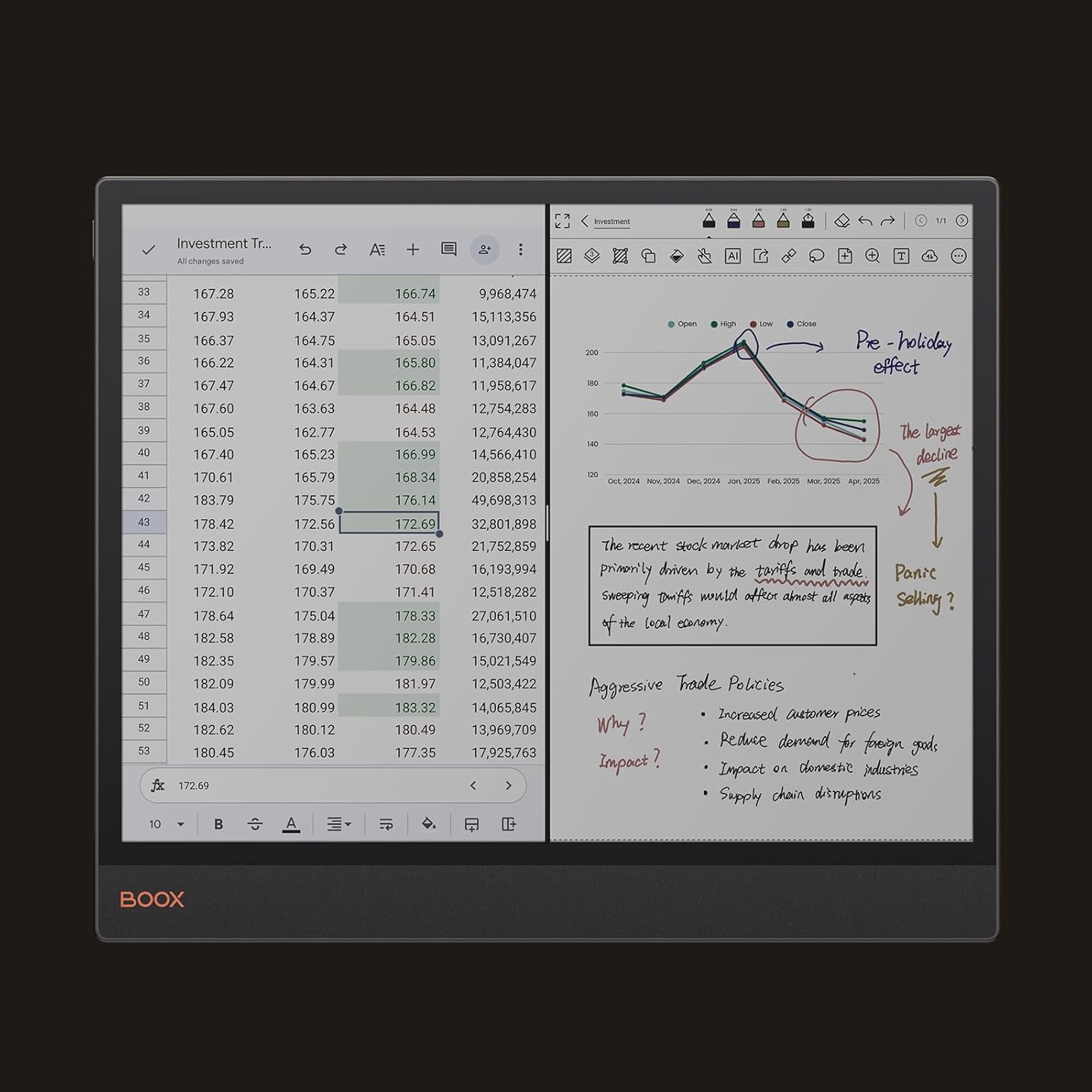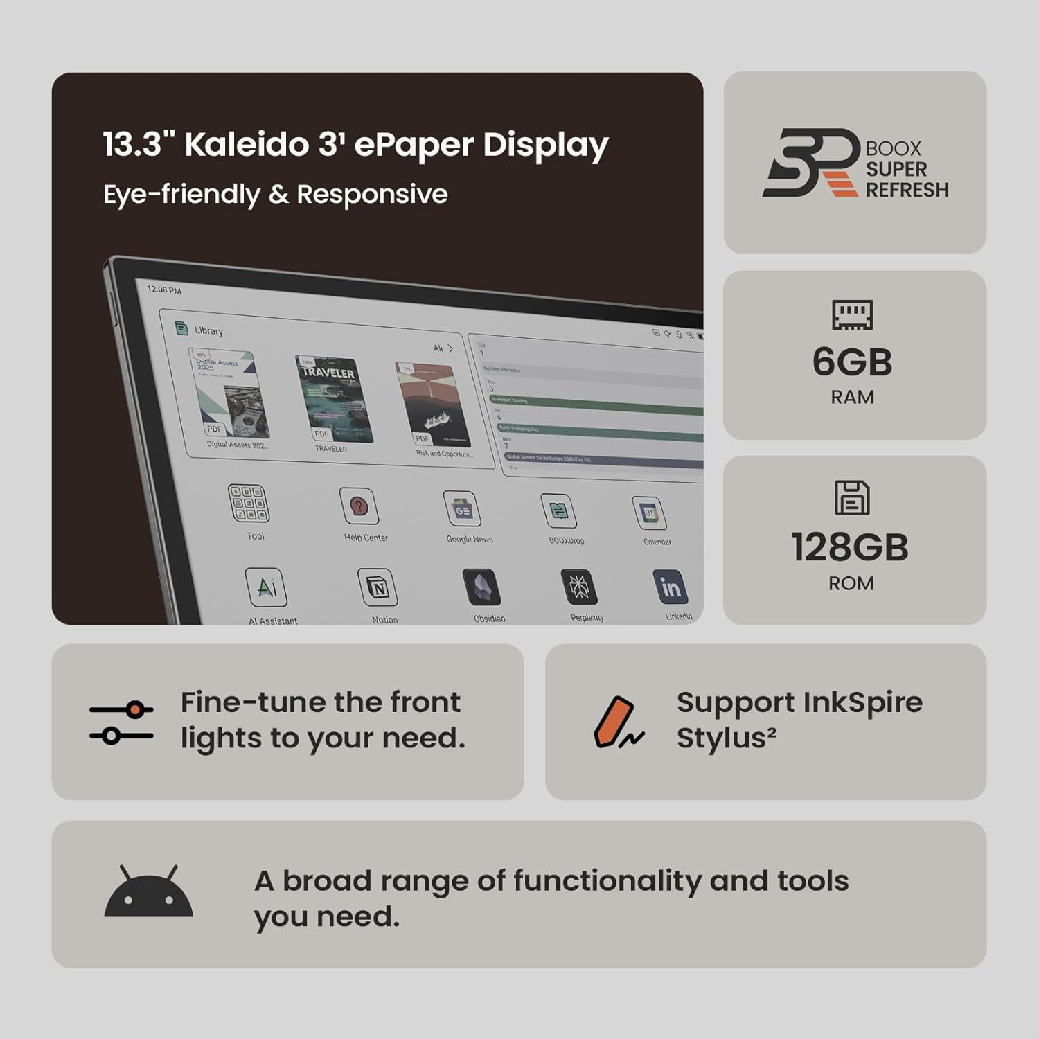Screen: 13.3″ Kaleido 3 (4,096 colors) glass screen with flat cover-lens