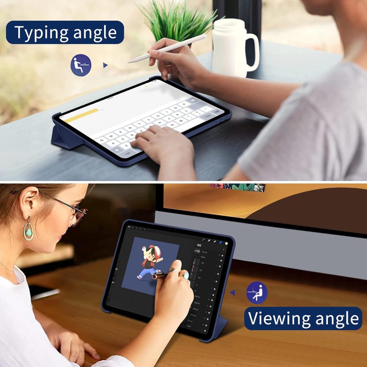 MULTIPLE VIEWING ANGLES: Trifold stand design with dual standing provide two positions for comfortable viewing or typing, you can have an excellent experience when you are relaxing or working