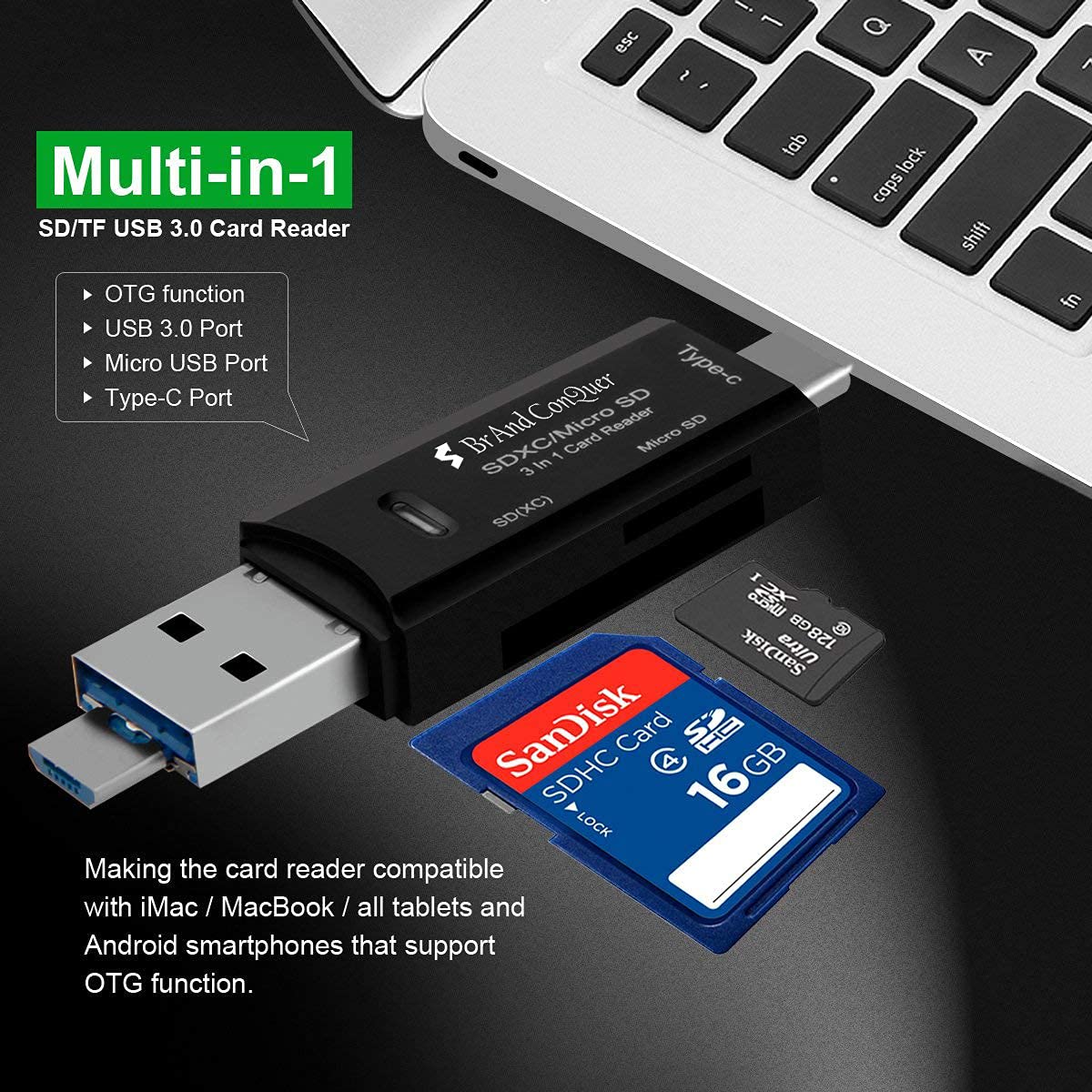 Brand Conquer 3 in 1 SD Card Reader | USB Type C, USB 3.0 and Micro USB, OTG, Memory Card | Portable Card Reader | Compatible with TF, SD, Micro SD, SDHC, SDXC, MMC, RS-MMC, Micro SDXC