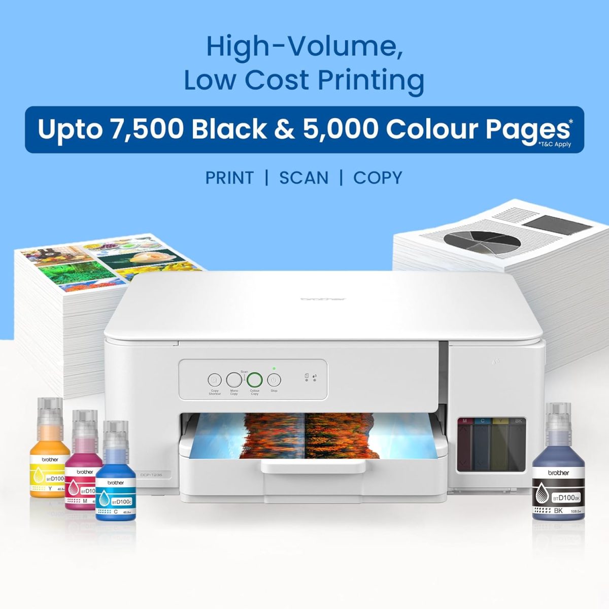 Get up to 7500 pages in Black and 5000 pages each in Cyan, Magenta & Yellow with Brother’s genuine ink bottles. Designed with Spill-Free & Precise Refill Technology, the smart nozzle ensures clean, accurate ink refilling—no mess, no stress! Ideal for high-volume printing at home or in small offices.