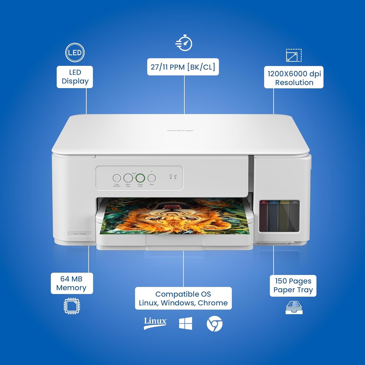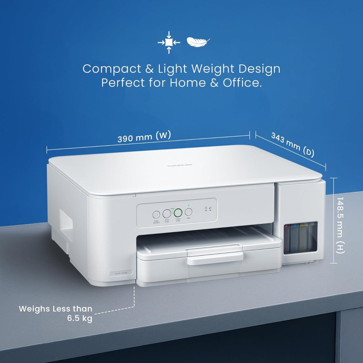The Brother DCP-T236 is your ideal home printer with a space-saving design, fast print speeds of up to 27 ppm (black) and 11 ppm (color). Enjoy smooth Print, Scan, Copy functions—perfect for everyday projects, homework, and creative tasks.
