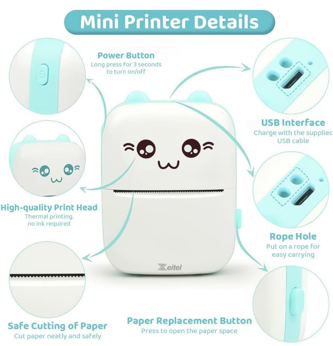 Compact and portable, a mini printer is the perfect companion for on-the-go printing needs. Whether you’re a student needing to print assignments or a professional requiring hard copies of documents, this handy device ensures your work is always within reach. With its sleek design and easy connectivity options, you can effortlessly print directly from your smartphone, tablet, or laptop. Say goodbye to the hassle of finding a printer and embrace the convenience of having one at your fingertips. Ideal for printing photos, notes, invoices, and more, a mini printer offers a versatile solution for all your printing requirements. Lightweight and travel-friendly, it seamlessly integrates into your mobile lifestyle, making it an indispensable accessory for the modern individual on the move. Multifunction Mini Printer Thermal Printer Valuable Portable & Clear Printer. Integrated Paper Outlet Cutting – Clean paper tearing, safe operation. Advanced Print Head – Printing effect is clearer and the service life is longer. Switch Control – Press to open and close, easy replacement of paper core. 1200mAh Built-in Battery – Wireless use, long battery life, print what you want anytime and anywhere Material: ABS; Printer Size: 4.3×3.1×1.4in (11*8*3.5cm) Weight: 160g; Print Type: Thermal Printing Resolution: 200dpi; Input Power: DC 5V, 1A Power Supply: Rechargeable Lithium Battery Package Include: 1 X Cute Printer 1 X Thermal Paper Roll Inside The Printer 1 X Charging Cable 1 X User Manual