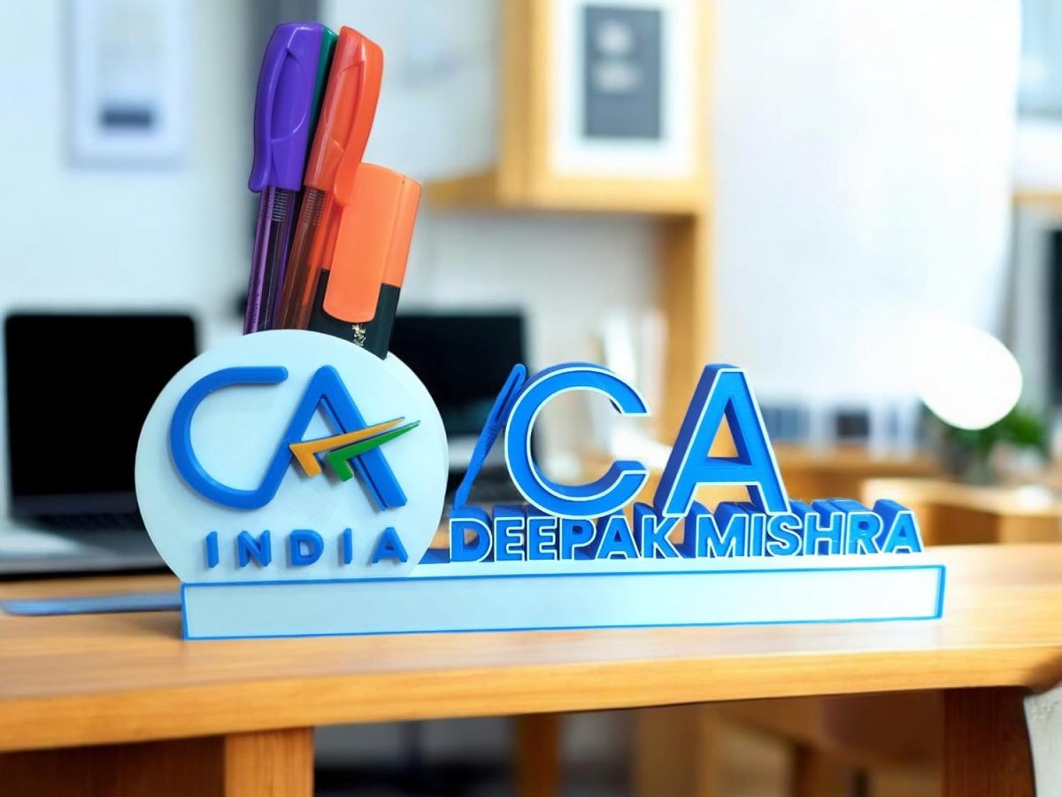 PREMIUM DESIGN: Elegant desktop pen stand featuring the new CA India logo, crafted with precision in sleek blue and white colours for a professional workspace appearance