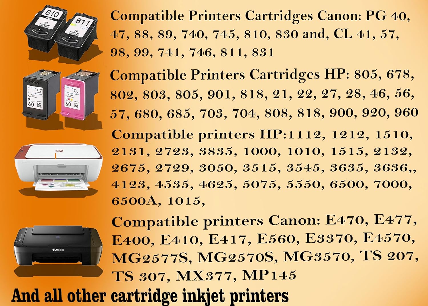 Compatible printers: HP 1112, 1212, 1510, 2131, 2723, 3835, 1000, 1010, 1515, 2132, 2675, 2729, 3050, 3515, 3545, 3635, 3636, , 4123, 4535, 4625, 5075, 5550, 6500, 7000, 6500A, 1015, Canon: E470, E477, E400, E410, E417, E560, E3370, E4570, MG2577S, MG2570S, MG3570, TS 207, TS 307, MX377, MP145 and all other cartridge inkjet printers