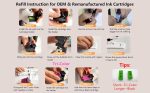 How To Refill: Suck required ink into syringe from the ink bottle. Around 3 -5 ML is required to fill in each colour holes and 3 ML – 15 ML in black cartridge. It Depends on your Cartridge mode, slowly push the piston of the syringe into the hole. It should be very slow and careful. Do not overfill the sponge. Watch carefully while injecting