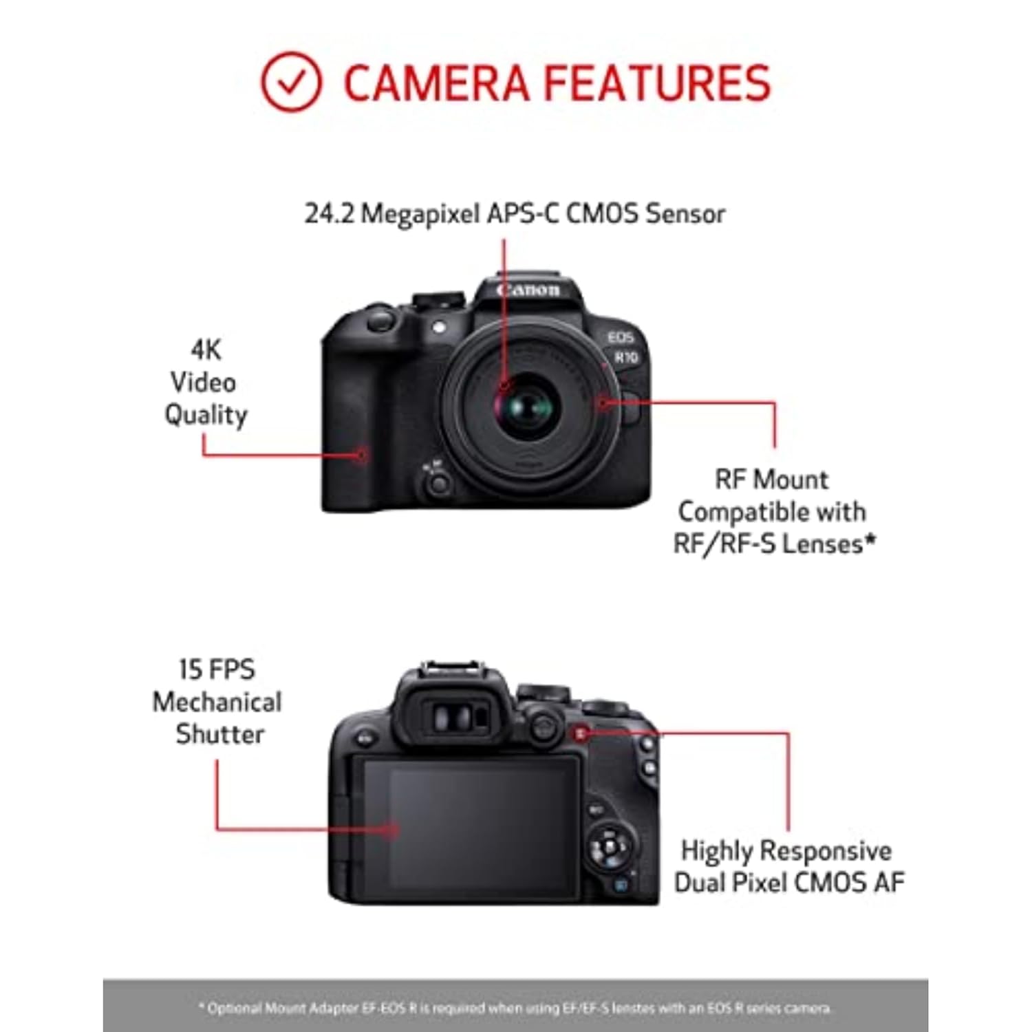 Canon EOS R10 24.2MP RF-S18-45mm f/4.5-6.3 is STM Mirrorless Camera (APS-C Sensor,4K UHD Video) – Black
