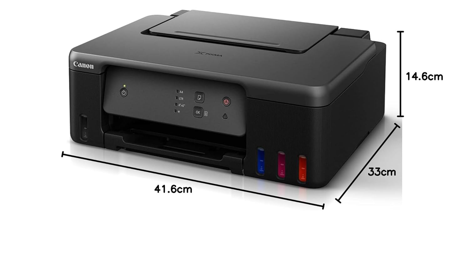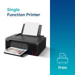 Page size: A4, A5, A6, B5, LTR, LGL, Executive, Oficio2, B-Oficio, M-Oficio, Legal (India), Foolscap, F4, 4 x 6″, 5 x 7″, 7 x 10″, 8 x 10″, Envelopes , Square, Card Size ,Custom Size- Width: 55 – 216 mm, Length: 89 – 1,200 mm; Max paper thickness: 64 to 275 GSM ; Maximum Input Sheet Capacity: 100 sheets (A4); Compatible ink:GI 71 Cyan, Magenta, Yellow, Black; Additional Printer Function:, Print modes- Standard and Economy ; Power wattage of printer: OFF: 0.1W, Standby (scanning lamp is off):0.6W, Copying (USB connection to PC): 14W