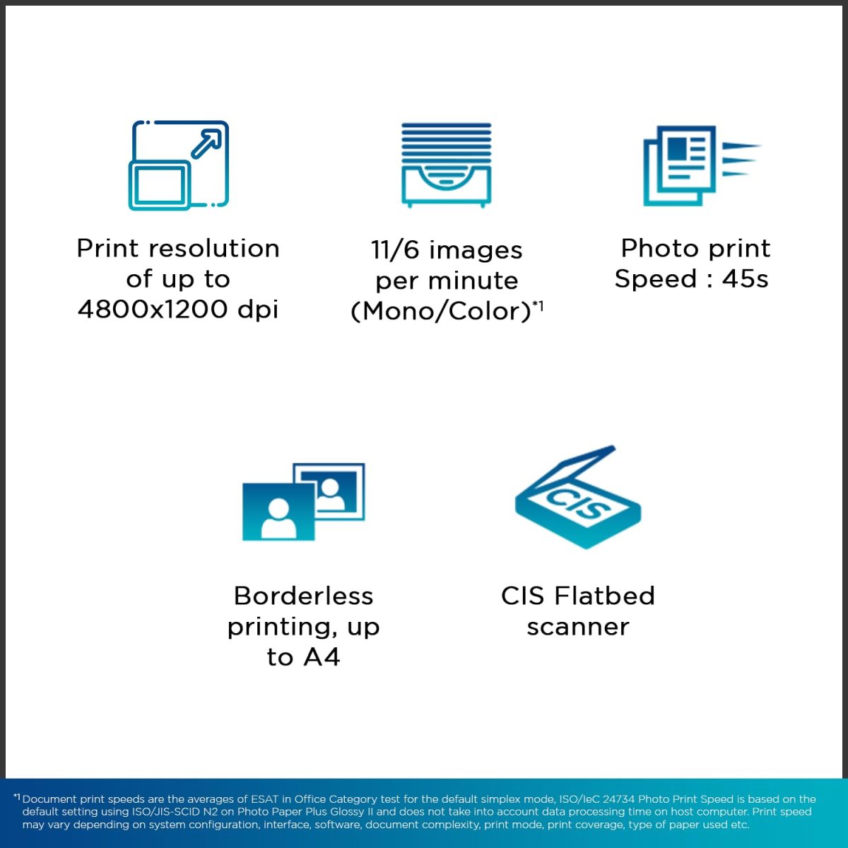 Page size: A4, A5, A6, B5, LTR, LGL, Executive, Oficio2, B-Oficio, M-Oficio, Legal (India), Foolscap, F4, 4 x 6″, 5 x 7″, 7 x 10″, 8 x 10″, Envelopes , Square, Card Size ,Custom Size- Width: 55 – 216 mm, Length: 89 – 1,200 mm; Max paper thickness: 64 to 275 GSM ; Maximum Input Sheet Capacity: 100 sheets (A4); Compatible ink:GI 71 Cyan, Magenta, Yellow, Black; Additional Printer Function:, Print modes- Standard and Economy ; Power wattage of printer: OFF: 0.1W, Standby (scanning lamp is off):0.6W, Printing (USB connection to PC): 14W