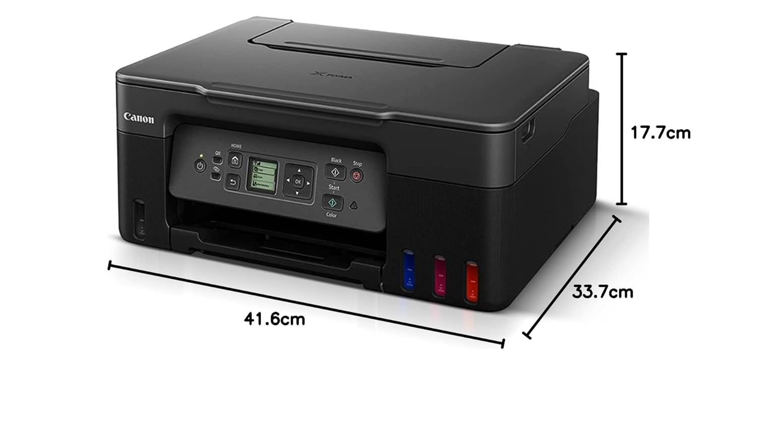 Printer type: Inkjet ; Functions: Print, Scan, Copy ; Printer output: Colour ; Connectivity: Wi-Fi, AirPrint, Mopria, Direct Wireless, USB 2.0 ; Scanner: Yes ; Scanner resolution:600 x 1200dpi OS Compatibility: Windows 11 / 10 / 8.1 / 7 SP1 (operation can only be guaranteed on a PC with a pre-installed Windows 7 or later), macOS 10.14.6 – 12 or later, Chrome OS; Mobile connectivity : Yes (via Canon Print Service, PIXMA Cloud Link, Canon PRINT Inkjet/SELPHY); Hardware Interface: USB 2.0 ; Enlarge/reduce option: No ; Duplex: No Maximum Print Speed: 11/6 (mono/color) images per minutePrint cost Monochrome: Rs 0.13 ; Print cost color: Rs 0.25 ; Maximum Print Resolution: 4800 x 1200 dpi Page size: A4, A5, A6, B5, LTR, LGL, Executive, Oficio2,B-Oficio, M-Oficio, Legal (India), Foolscap, F4,4 x 6″, 5 x 7″, 7 x 10″, 8 x 10″, Envelopes , Square, Card Size ,Custom Size- Width: 55 – 216 mm, Length: 89 – 1,200 mm; Max paper thickness: 64 to 275 GSM ; Maximum Input Sheet Capacity: 100 sheets (A4); Compatible ink:GI 71 Cyan, Magenta, Yellow, Black; Additional Printer Function: Print modes- Standard and Economy ; Power wattage of printer: OFF: 0.1W, Standby (scanning lamp is off):0.6W, Copying (USB connection to PC): 15W Special Features: Borderless Print, 1.3 inch display (Monochrome)with backlight; Ideal Usage: Home, Home Office; Included Components: Printer, Power Cord, USB cable, Instruction Manual, 1 set of GI71 Cyan, Magenta, Yellow and Black ink bottles Page Yield: GI71 BK- 6000 prints, GI71 Cyan, Magenta, Yellow- 7700 prints as per ISO/IEC 24711 (for A4 size) using ISO/IEC 24712 test file. 1+1 Year or 30000 prints (whichever is earlier) onsite warranty on registering the product with Canon. Warranty applicable from the date of purchase and on manufacturing defects only. Free one time installation support from Canon
