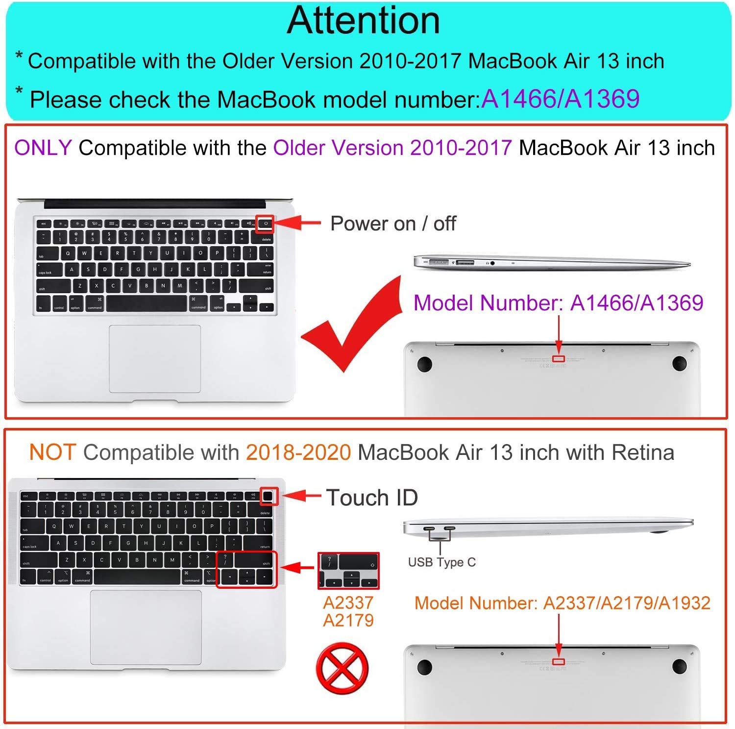 The case was designed ONLY to be compatible with Older Version MacBook Air 13 inch (model: A1369 / A1466 — MQD32LL/A, MQD42LL/A, MMGF2LL/A, MMGG2LL/A, MJVE2LL/A, MJVG2LL/A, MD760LL/B, MD760LL/A, MD761LL/A, MD231LL/A, MD232LL/A, MC503LL/A, MC504LL/A, MC965LL/A, MC966LL/A) 2017/2016/2015/2014/2013/2012/2011/2010 release. WARNING: This case is NOT compatible with other model MacBooks.
