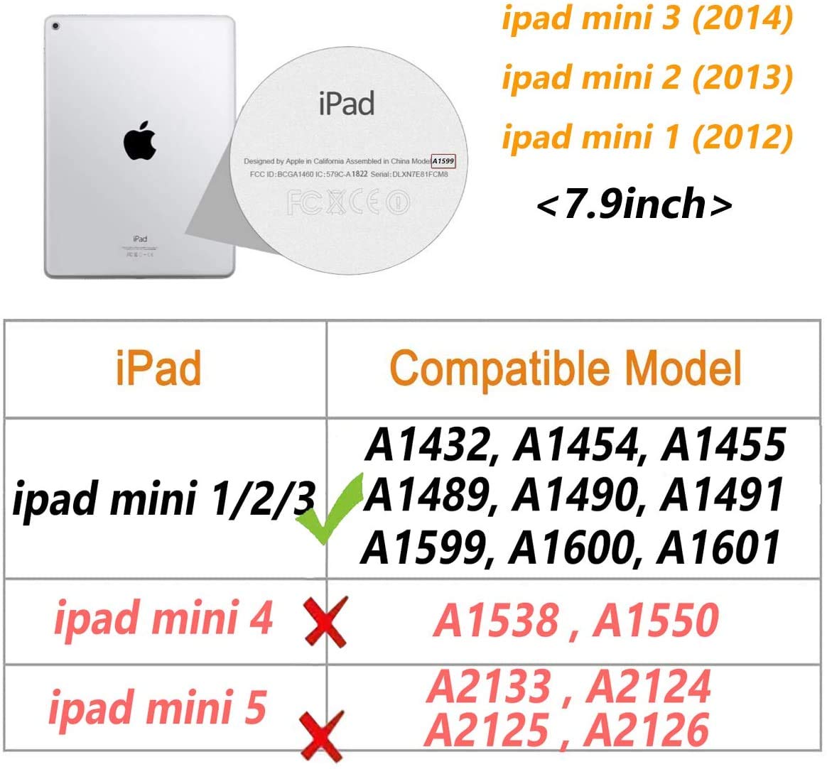 Specially crafted for Below iPad Models: 1. iPad mini (aka iPad mini 1) A1432 (Wi-Fi) A1454 or A1455 (Wi-Fi + cellular) 2. iPad mini 2 (aka iPad mini with Retina display) A1489 (Wi-Fi) A1490 (Wi-Fi + cellular) 3.iPad mini 3 A1599 (Wi-Fi) A1600 (Wi-Fi + cellular).