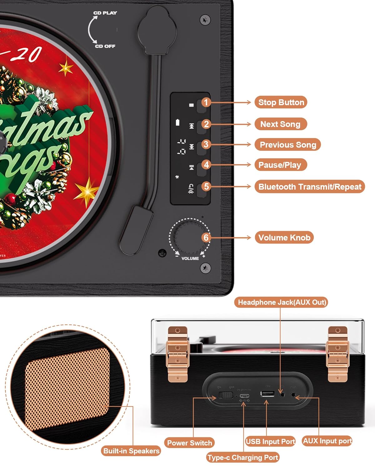 All-in-One CD Player: 1. Portable CD player 2. Bluetooth transmitter and receiver 3. Built-in stereo speakers 4. AXU IN and headphone jack 5. Rechargeable battery 6. Digital display