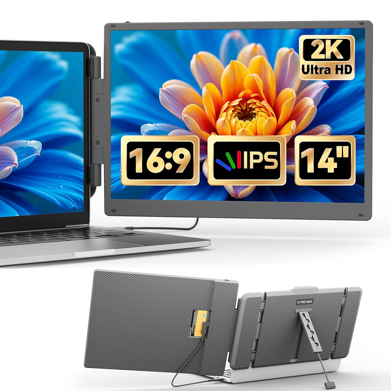 S1 PRO MAX is a plug-and-play, versatile external, portable folding single-screen laptop splitter. It allows for the quick setup of a personal mobile workstation. It provides a perfect solution for laptop users to have multi-screen mirroring or extended display, significantly boosting work efficiency by up to 200% and enabling efficient multitasking. Additionally, it supports screen mirroring on select smartphones, such as Samsung and iPhone, as well as the use of the smartphone’s built-in desktop mode and audio-video transmission capabilities. The S1 PRO MAX holder is easy to use. Clamp the holder to the top of the computer screen, and it can be easily fixed without falling off. It can support laptops ranging from 13 inches to 16.5 inches and can be removed and used as a single screen. The screen has its own support that can be adjusted for different angles, providing a fun experience for professionals, office workers, gamers, stock traders, entrepreneurs, programmers, and students. The S1 PRO MAX screen can independently adjust parameters such as brightness, sound, and contrast. It is equipped with Type-C/USB-C interfaces with DisplayPort (DP) support, allowing for versatile video and data expansion without the need for a docking station. As long as the laptop has a Type-C port with combined signal and power capabilities, you can achieve a seamless connection and display. Devices such as desktop computers, laptops, mini PCs, set-top boxes, and gaming consoles with HDMI output interfaces can directly connect to the display. However, the screen needs to be powered externally in order to light up (using the custom HDMI-to-Type-C cable to connect the product to the computer). Finally, the S1 PRO MAX screen Extender can provide a complete 180-degree rotation on a single screen. You can choose your best viewing angle for the optimum visual experience.