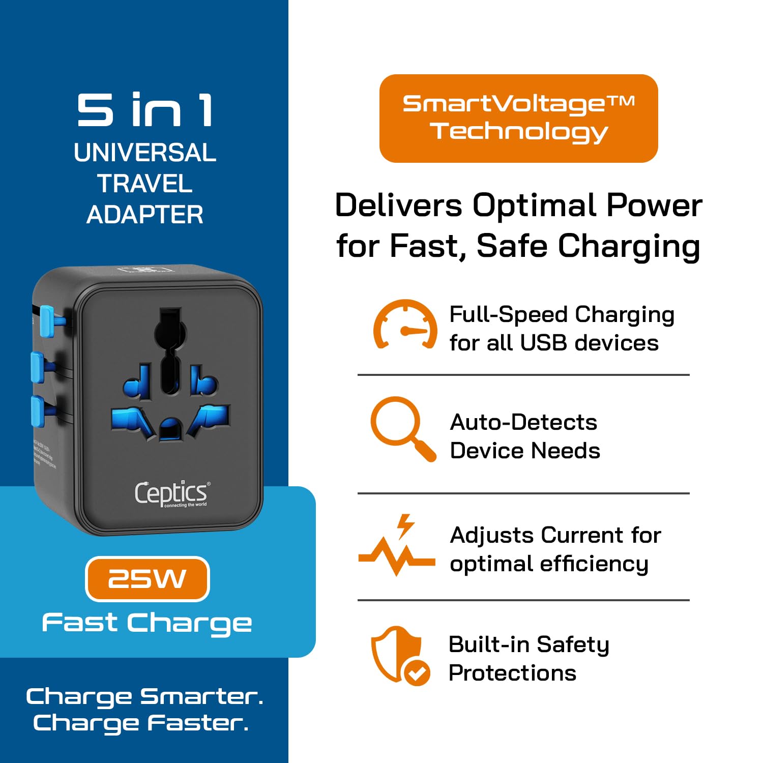 5 in 1 travel adapter: This universal adapter includes 1 universal AC input, 1 N. America/Japan input, 2 USB-C 25W ports and 1 USB-A port (18W)—perfect for fast charging smartphones, iPhones, tablets, iPads, laptops, and more, anywhere in the world.