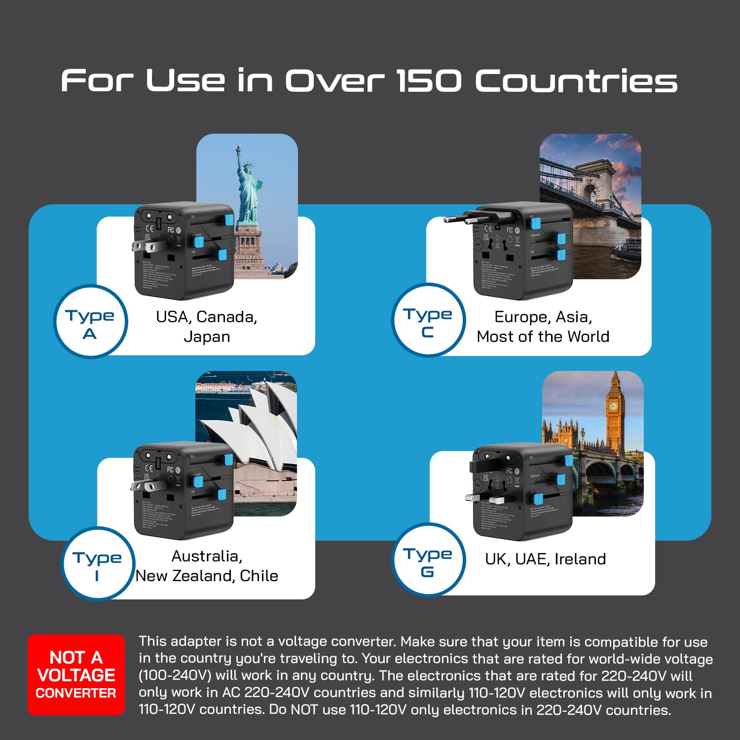 Multiple Output Plugs: Type A (Japan, USA, Canada, Mexico), Type I (China, Australia, New Zealand), Type C (Europe, South America, Asia), and Type G (UK, Ireland, Singapore, Hong Kong).