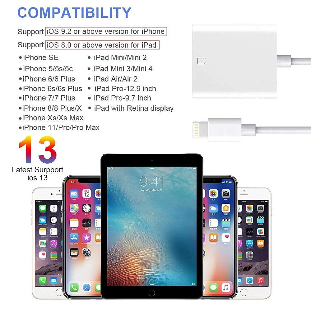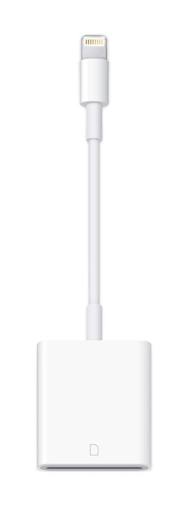 The Lightning to SD Card Camera Reader supports data transfer speeds up to USB 3, standard photo formats, including JPEG and RAW, along with SD and HD video formats, including H.264 and MPEG-4. (USB 3 speeds exclusive to iPad Pro. All other iPad models support USB 2 speeds.)