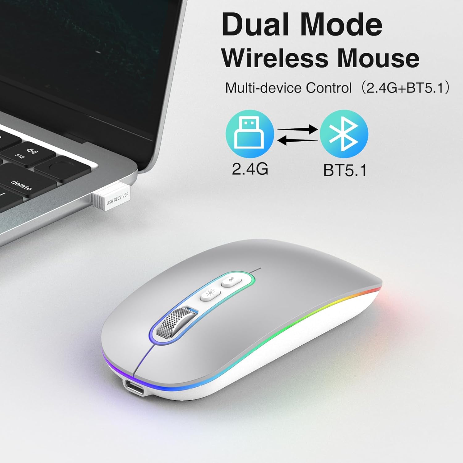 【Dual Mode Mouse for Laptop】The laptop mouse offers an easy switch between Bluetooth 5.1 and 2.4G wireless connections, bringing stable and reliable performance. Stable connection with quick response and smooth tracking. Bluetooth cordless 5.1 ensures quick response and precise movement, while 2.4G provides plug & play convenience, no need for a driver (USB-A receiver stored in the bottom of the mouse)