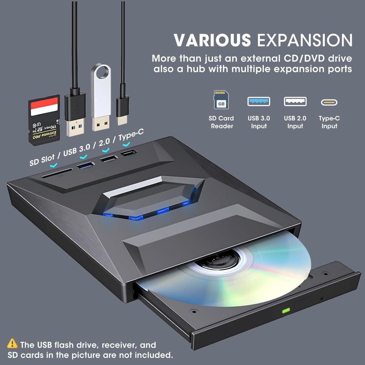Convenient Multi-Functionality: Our external CD/DVD drive goes beyond just playing CDs and DVDs. It comes with a separate SD/TF card slot, 1 USB 3.0 A port, and 2 USB 2.0 A/C ports, providing you with additional options to connect and transfer data from multiple devices simultaneously. This versatility makes it an excellent choice for those who require multiple device connectivity on the go. (SD card and TF card cannot be read at the same time)