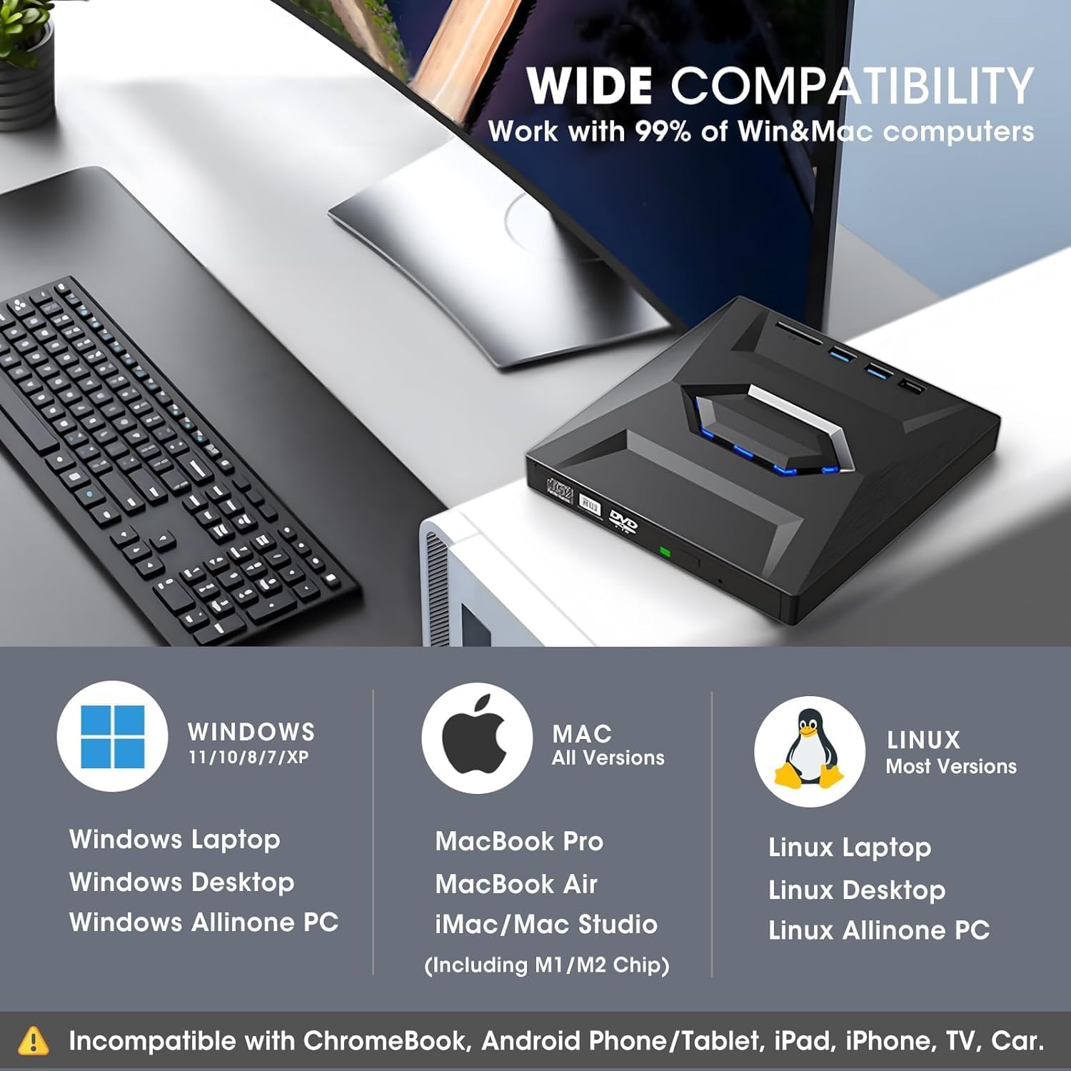 Fast and Efficient Data Transfer: With a high-speed USB 3.0 port, this external CD/DVD drive offers a transfer rate of up to 5Gbps. backward compatible with USB2.0, USB1.1. Whether you’re transferring large files or burning discs, the rapid data transfer capabilities ensure a seamless experience. (Note: Not compatible with iPads, phones, Chromebooks, TVs, cars, or Blu-ray)