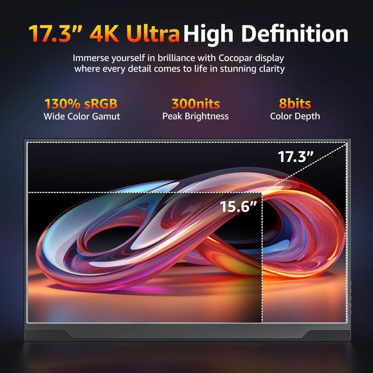 cocopar Portable Monitor 4K – 17.3 Inch UHD FreeSync HDR IPS 100% RGB 3840×2160 Lightweight Eye Care Computer Display with Type-C Mini DP HDMI for PS4/5 Laptop PC Mac, with Smart Case
