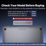 Check Your Model: Only compatible with MacBook Air 13 inch 2020 2019 2018 versions with Retina display and Touch ID. Before purchasing, please check the model number (A2337, A2179 or A1932) on the back of the laptop. # Not fit old model A1446 or other MacBook models