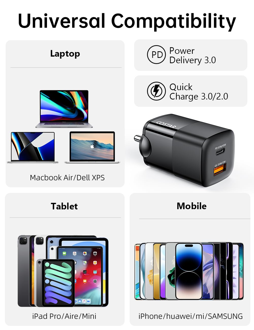 ✔【Charge 2 Devices at Once】With 1 USB-A and 1 USB-C ports, this fast charger allows you to charge your laptop and phone at the same time. Thanks to the Costar II’s unique Dynamic Power Distribution feature, all devices are charged at optimal speeds without any slowdowns.